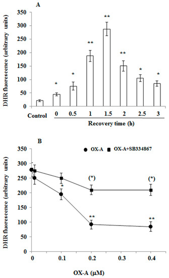 Orexin-A (OX-A) prevents oxygen–glucose deprivation (OGD)-induced reactive oxygen species (ROS) formation in cortical primary neurons. (A) Dihydrorhodamine 123 (DHR)-loaded primary neurons were exposed to OGD for 60 min followed by reoxygenation for increasing time intervals or were maintained under normoxic conditions. After treatment, the cells were observed with a Leica DMI6000 fluorescence microscope equipped with a Leica DFC320 cooled digital CCD camera (Leica Microsystems). The resulting images were analyzed to quantify the mean fluorescence of individual cells using the Metamorph Imaging Software (Leica MetaMorph AF). Results are expressed as arbitrary units and represent the mean ± SEM calculated from three to five separate experiments, each performed in duplicate. * p < 0.05; ** p < 0.01 vs. normoxic-treated cells (one-way ANOVA followed by Bonferroni test). (B) DHR-loaded primary neurons were treated with the different concentration of OX-A for 30 min in the absence or presence of SB334867 (10 µM, added 15 min before OX-A) and, finally, exposed to OGD for 60 min. After treatment, the cells were analyzed with a fluorescence microscope as described in (A). Results expressed as arbitrary units represent the mean ± SEM calculated from three to five separate experiments, each performed in duplicate. * p < 0.05, ** p < 0.001 vs. OGD-treated cells; (**) p < 0.01 vs. OX-A-treated cells (one-way ANOVA followed by Bonferroni test).
