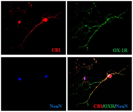 Expression of cannabinoid type-1 (CB1) and orexin-1 receptor (OX-1R) in primary cortical neurons. Representative micrographs of immunocytochemical staining of the CB1 (red signal) or OX-1R (green signal) receptors in a primary culture of cortical neurons. Neuronal-specific nuclear protein (NeuN) antibody (blue signal) was used as marker of neuronal cells. Scale bar: 20 µm.