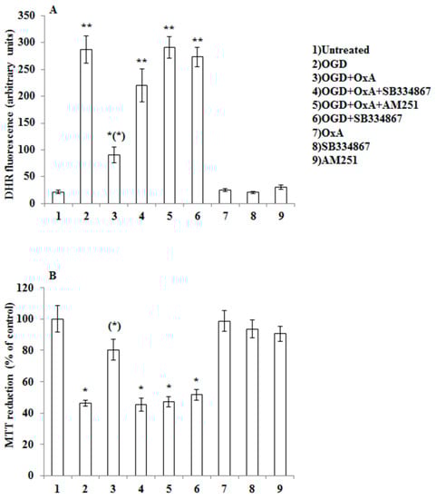 OX-A prevents OGD-mediated ROS toxicity in primary cortical neurons. (A) DHR-loaded cells were incubated with AM251 (0.5 µM) or SB 334867 (10 µM) for 15 min, exposed to OX-A (0.2 µM) for an additional 30 min and, finally, subjected to OGD for 60 min. The cells returned to the incubator under normoxic conditions for 1.5 h before analysis with a fluorescence microscope as described in Figure 1. Results expressed as arbitrary units represent the mean ± SEM calculated from three to five separate experiments, each performed in duplicate. * p < 0.05, ** p < 0.001 vs. control cells; (*) p < 0.001 vs. OGD-treated cells (one-way ANOVA followed by Bonferroni test). (B) Neurons were treated as described in (A) and after 20 h in the incubator under normoxic conditions were analyzed for cell viability using the 3-(4,5-dimethylthiazol-2-yl)-2,5-diphenyltetrazolium bromide (MTT) assay. Results are expressed as the percentage of viable cells detected following OGD compared to control normoxic plates. Results represent the mean ± SEM of three to five separate experiments, each performed in duplicate. * p < 0.001 vs. control cells; (*) p < 0.001 vs. OGD-treated cells (one-way ANOVA followed by Bonferroni test).