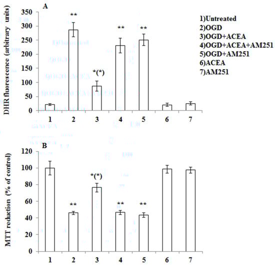 CB1 stimulation with arachidonyl-2′-chloroethylamide (ACEA) prevents OGD-induced ROS formation as well as toxicity in primary cortical neurons. (A) DHR-loaded cells, were incubated for 15 min with AM251 (0.5 µM), exposed to ACEA (0.5 µM) for an additional 15 min and, finally, subjected to OGD (60 min). After 1.5 h incubation under normoxic conditions, the cells were analyzed with a fluorescence microscope as described in Figure 1. Results expressed as arbitrary units represent the mean ± SEM calculated from three to five separate experiments, each performed in duplicate. * p < 0.05, ** p < 0.001 vs. control cells; (*) p < 0.001 vs. OGD-treated cells (one-way ANOVA followed by Bonferroni test). (B) Neurons were treated as in (A), exposed to OGD for 60 min, and after 20 h under normoxic conditions, were analyzed for cell viability using the MTT assay. Results represent the mean ± SEM of three to five separate experiments, each performed in duplicate. * p < 0.05, ** p < 0.001 vs. control cells; (*) p < 0.01 compared to OGD-treated cells (one-way ANOVA followed by Bonferroni test).