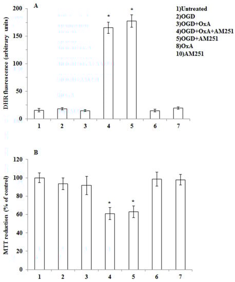 OGD treatment fails to induce ROS formation and toxicity in primary cortical neurons isolated from MAGL null mice. (A) Primary neurons isolated from MAGL null mice, loaded with DHR, were incubated with AM251 (0.5 µM, 15 min), exposed to OX-A (0.2 µM) for an additional 30 min and, finally, subjected to OGD for 60 min. After 1.5 h incubation under normoxic conditions, the cells were analyzed with a fluorescence microscope as described in Figure 1. Results expressed as arbitrary units represent the mean ± SEM calculated from three to five separate experiments, each performed in duplicate. * p < 0.0001 vs. OGD-treated cells (one-way ANOVA followed by Bonferroni test). (B) Neurons were treated as in (A), exposed to OGD for 60, and after 20 h under normoxic conditions, analyzed for cell viability using the MTT assay. Results represent the mean ± SEM of three separate experiments, each performed in duplicate. * p < 0.01 vs. OGD-treated cells (one-way ANOVA followed by Bonferroni test).