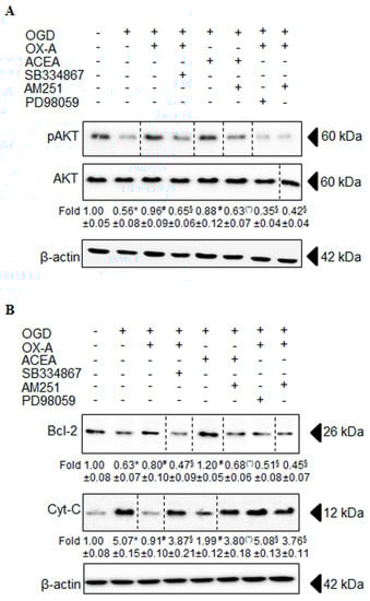 Effect of OX-A or ACEA on OGD-induced apoptosis in primary cortical neurons. (A) Neurons were incubated with AM251 (0.5 µM), SB 334867 (10 µM) or PD98059 (50 µM) for 15 min, exposed to OX-A (0.2 µM) for an additional 30 min and, finally, subjected to OGD for 60 min. The cells returned to the incubator under normoxic conditions for 20 h prior to analyzing the total cell extract with Western blotting using anti-phospho-Akt serine 473 or AKT antibodies. Fold data represent the mean ± SEM of three separate experiments, each performed in duplicate, normalized to the total proteins present in the extract of control cells. (B) Cells, treated as in (A), returned to the incubator under normoxic conditions for 20 h prior to isolating the mitochondrial and cytosolic fractions. Cytosolic fractions were finally processed for Western blot analysis using cytochrome c or Bcl-2 antibodies. Fold data represent the mean ± SEM of three separate experiments, each performed in duplicate, normalized to the total proteins present in the cytosolic fractions of control cells. Blots shown are representative of three separate experiments with similar outcomes. The β-actin bands confirm that similar amounts of proteins were loaded on the gel for each sample. * p < 0.01 vs. untreated cells; # p < 0.01 vs. OGD-treated cells; § p < 0.01 vs. OGD/OX-A-treated cells; (*) p < 0.01 vs. OGD/ACEA-treated cells (one-way ANOVA followed by Bonferroni test).