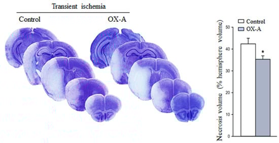 To determine whether OX-A treatment may attenuate the damage induced by ischemia in vivo, we examined the effect of the neuropeptide in MCAO mice. We carried out experiments in mice undergoing transient MCAO treated systemically with OX-A. The drug was injected intraperitoneally 30 min before MCAO at a dose of 40 µg/kg, which was shown to be fully effective in in vivo studies [18]. Treatment with OX-A significantly reduced the infarct volume (Figure 7).