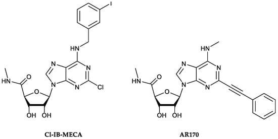 Chemical structures of the A3AR reference agonist 2-chloro-N6-(3-iodobenzyl)-adenosine-5′-N-methyluronamide (Cl-IB-MECA, left) and the potent and selective A3AR agonist AR170 (right) employed in this study.
