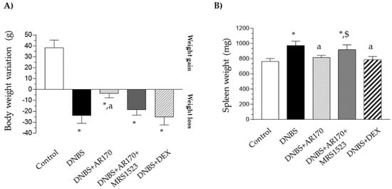 The effect of AR170 (3 mg/kg/day), alone or in combination with MRS1523 (8 mg/kg/day) or dexamethasone (DEX; 1 mg/kg/day), on body weight (A) and spleen weight; (B) at day 6 after the induction of colitis with 2,4-dinitrobenzene sulfonic acid (DNBS). Each column represents the mean ±SEM (n = 8–10). * p < 0.05, significant difference vs. the control group; a p < 0.05, significant difference vs. the DNBS group; $ p <0.05, significant difference vs. the DNBS+AR170 group.