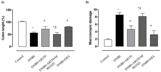 Effects of AR170 (3 mg/kg/day), alone or in combination with MRS1523 (8 mg/kg/day) or DEX (1 mg/kg/day), on colon length (A) and the macroscopic damage score (B) at day 6 after the induction of colitis with DNBS. Each column represents the mean ±S.E.M. (n = 8–10). * p < 0.05, significant difference vs. control group; a p < 0.05, significant difference vs. DNBS group; $ p < 0.05, significant difference vs. DNBS + AR170 group.