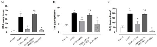Colonic inflammation induced by DNBS was associated with a significant increase in tissue TNF levels (11.5 ± 0.52 pg/mg tissue) compared to the values obtained in the control animals (3.8 ± 0.9 pg/mg tissue). Treatment with AR170 or DEX significantly decreased the concentration of this cytokine in colonic tissues (Figure 4B).