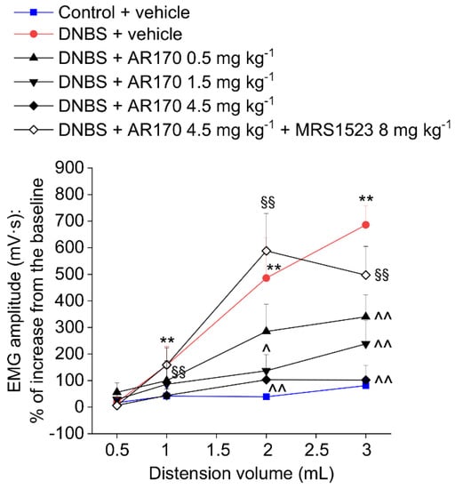 Visceromotor response (VMR) to the colorectal distension of DNBS treated animals after the acute administration of AR170 (0.5–4.5 mg/kg i.p.) both in the absence and the presence of the selective A3AR antagonist MRS1523 (8 mg/kg i.p., injected 15 min before AR170). Tests were performed 14 days after DNBS injection and 15 min after the acute administration of AR170. Control animals received the vehicle. Each value represents the mean ± S.E.M. (n = 4). * p < 0.05 and ** p < 0.01 vs. the control + vehicle treated animals. ^ p < 0.05 and ^^ p < 0.01 vs. DNBS + vehicle treated animals. §§ p < 0.01 vs. DNBS + AR170 4.5 mg kg−1 treated animals.