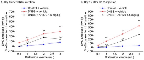 Visceromotor response (VMR) to the colorectal distension of DNBS-treated animals after the repeated administration of AR170 (1.5 mg/kg/day). The test was performed on day 8 (A) and 15 (B) after DNBS injection, 24 h after the last treatment. Control animals received the vehicle. Each value represents the mean ± S.E.M. (n = 4). * p < 0.05 and ** p < 0.01 vs. the control + vehicle treated animals. ^ p < 0.05 and ^^ p < 0.01 vs. DNBS + vehicle treated animals.