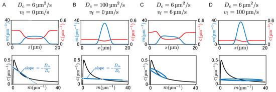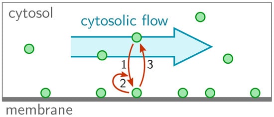 where and denote the rate of attachment from the cytosol to the membrane and detachment from the membrane to the cytosol, respectively. The dynamics given by Equation (1) conserve the average total density