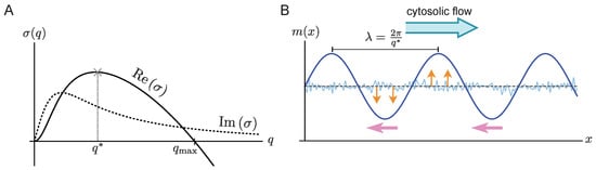 (A) Sketch of real (solid) and imaginary (dotted) part of a typical dispersion relation with a band of unstable modes. (B) The initial dynamics of a spatially homogeneous state with a small random perturbation (blue thin line). The direction of cytosolic flow is indicated by a blue arrow. The typical wavelength () of the initial pattern is determined by the fastest growing mode and the phase velocity is determined by the value of the imaginary part of dispersion relation at the fastest growing mode (). The growth of the pattern is indicated by orange arrows, while the traveling direction is indicated by pink arrows.