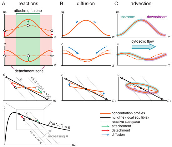 Consider a spatially homogeneous steady state, perturbed by a slight redistribution of the local total density . The dashed orange line in Figure 3A shows such a perturbation where the membrane concentration (Figure 3A top) is slightly perturbed in a sinusoidal fashion. In phase space this is represented by a density distribution that slightly deviates from the spatially homogeneous steady state (marked by the orange dashed line). Here, the open star and open circle mark the minimum and maximum of the local total density, respectively. The local total density determines the local reactive equilibrium concentrations and (cf. Equation (5), replacing the average mass by the local mass ). In phase space (Figure 3A bottom) these local equilibria can be read off from the intersections (marked by black circles) of the reactive subspaces (gray solid lines) and the reactive nullcline (black solid lines). A slight redistribution of the local total density shifts the reactive equilibria, leading to reactive flows towards these shifted equilibria (red and green arrows in Figure 3A). Thus, the reactive equilibria, and thereby the reactive flows, are encoded in the shape of the reactive nullcline in phase space. If the nullcline slope is negative, increasing the total density leads to a decreasing equilibrium cytosolic concentration and therefore to attachment (green arrows in Figure 3A). Conversely, in regions of lower total density, the equilibrium cytosolic concentration increases via detachment (red arrows in Figure 3A). Hence, regions of high total density become self-organized attachment zones and regions of low total density become self-organized detachment zones [37] (green and red areas in Figure 3 top and middle).