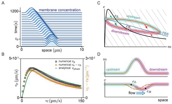 At time , a constant cytosolic flow in the positive x-direction is switched on. Consistent with the expectation from linear stability analysis, we find that the peak propagates against the flow direction in the negative x-direction (solid lines in Figure 4A). The diffusive fluxes no longer balance for this propagating steady state, such that the phase-space trajectory is no longer embedded in the FBS. Instead, as advective flow shifts the cytosol concentration profile relative to the membrane profile, the phase-space trajectory becomes a loop (Figure 4C). On the upstream side of the peak, the cytosolic density is increased, such that net attachment—which is proportional to the cytosolic density—is increased relative to net detachment. Conversely, the reactive balance is shifted towards detachment on the downstream side. As a result of the reactive flow is approximately proportional to the distance from the reactive nullcline in phase space, the asymmetry between net attachment and detachment on the upstream and downstream side of the peak can be estimated by the area enclosed by the loop-shaped trajectory in phase space.