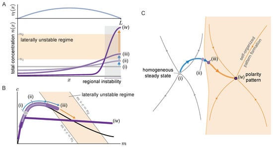 Starting from the homogeneous steady state (i), the non-uniform advective flow redistributes mass in the cytosol (ii). Due to this redistribution of mass, the local reactive equilibria shift as we have seen repeatedly here and in earlier studies of mass-conserving systems [31,47]. In fact, as long as the gradients of both the membrane and cytosol profiles are shallow, the concentrations remain close to the local equilibria, as evidenced by the density distribution in phase space spreading along the reactive nullcline (see profile (ii) in Figure 6A,B). As long as there is no laterally unstable region, the mass accumulation is limited by the counteracting diffusive flow in the cytosol. Eventually, the region where mass accumulates (here the right edge of the domain) enters the laterally unstable regime (see profile iii). In this laterally unstable region, cytosol diffusion will enhance the accumulation of mass via the mass-redistribution instability, until it is limited by the much slower membrane diffusion. In the phase plane (Figure 6B), the laterally unstable regime corresponds to the range of total densities where the nullcline slope has a steeper negative value than the flux-balance subspace slope () (More precisely, the size of the laterally unstable region must be larger than the shortest unstable mode (corresponding to the right edge of the band of unstable modes in the dispersion relation (Figure 2A))). The mass-redistribution instability in this region, based on the self-organized formation of attachment and detachment zones (cf. Section 3.2) will lead to the formation of a polarity pattern there (iv). Thus, the onset of a regional lateral instability marks the transition from flow-guided dynamics to self-organized dynamics.