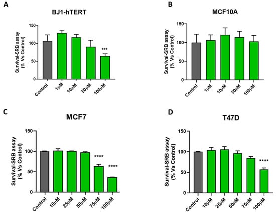 Effects of deferiprone (DFP) on cell viability in MCF7, T47D, hTERT-BJ1, and MCF10A cells. To evaluate the effects of DFP on cell viability, we used the sulphorhodamine (SRB) assay in hTERT-BJ1 fibroblasts, MCF10A, MCF7, and T47D breast cancer cells. (A,B) Note that ~70% of hTERT-BJ1 fibroblasts and nearly 100% of MCF10A remained viable at 100 μM of DFP treatment after 5 days of treatment. (C,D) In contrast, DFP dose dependently inhibited cell viability in MCF7 and T47D cell monolayers after 5 days of treatment, with an IC-50 of between 75 and 100 μM. *** p < 0.0001; **** p < 0.00001.