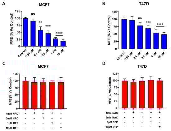 DFP inhibits cancer stem cell (CSC) propagation in MCF7 and T47D cells. We used a 3D tumorsphere assay to as a read-out to measure the CSC activity. This assay quantitates the functional ability of CSCs to undergo anchorage-independent growth under low-attachment conditions. MFE = Mammosphere Formation Efficiency. (A) Note that DFP potently inhibits 3D anchorage-independent growth, with an IC-50 of ~100 nM, after 5 days of treatment. ns = not significant; ** p < 0.001; *** p < 0.0001; **** p < 0.00001. (B) Note that DFP potently inhibits 3D anchorage-independent growth, with an IC-50 of ~0.5 to 1 μM after 5 days of treatment. ns = not significant; *** p < 0.0001; **** p < 0.00001. (C,D) DFP treatment at 1 and 10 μM in the presence of 1 mM and 5 mM of N-acetyl-cysteine (NAC).