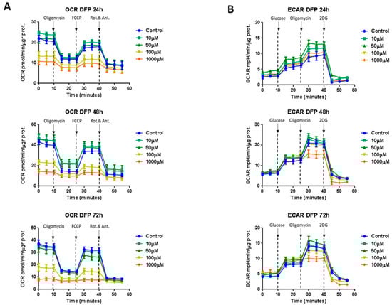 DFP reduces the mitochondrial and glycolytic metabolism in MCF7 cells: 24 to 72 h of treatment. (Panel A) Note that the DFP treatment significantly inhibited the oxygen consumption (OCR) in a time-dependent and dose-dependent fashion, showing a consistent reduction in oxygen consumption already at a concentration of 100 μM. Here are shown the 24, 48, and 72 h time points, respectively. (Panel B) DFP treatment slightly reduced the extracellular acidification after 72 h treatment at a concentration of 1 mM. Here are shown 24, 48, and 72 h time points, respectively.