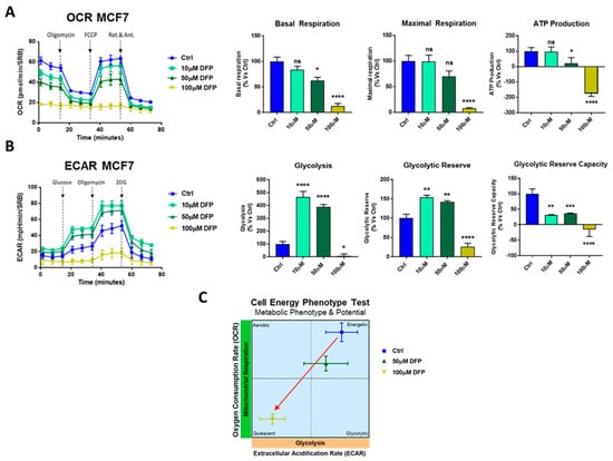 DFP reduces the OCR and extracellular acidification rates (ECAR) in MCF7 cells: 120 h of treatment (5 days). (A) Note that DFP dose dependently inhibited OCR, with maximal effects at 100 μM, resulting in severe ATP depletion. Significantly, basal respiration reduction and ATP depletion were also observed at 50 μM. ns = not significant; * p < 0.01; ** p < 0.001; **** p <0.00001. (B) Note that DFP dose dependently inhibited ECAR, with maximal effects at 100 μM, resulting in the near complete inhibition of glycolysis. ns = not significant; * p <0.01; ** p < 0.001; *** p < 0.0001; **** p < 0.00001. (C) OCR vs ECAR metabolic phenotype and potential is represented by following the manufacturer’s guidelines and instructions (Seahorse, Agilent Technologies). The energy plot shows that the 100 μM DFP-treated cells are clearly metabolic quiescent compared with the vehicle alone-treated cells.