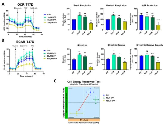 DFP reduces OCR and ECAR in T47D cells: 120 h of treatment (5 days). (A) Note that DFP dose dependently inhibited OCR, with maximal effects at 100 μM, resulting in severe ATP depletion. Significantly, basal respiration reduction and ATP depletion were also observed at 100 μM. ns = not significant; * p < 0.01; ** p < 0.001; **** p <0.00001. (B) Note that DFP inhibited ECAR, with maximal effects at 100 μM, resulting in the near complete inhibition of glycolysis. ns = not significant; * p < 0.01; **p < 0.001; **** p < 0.00001. (C) OCR vs ECAR metabolic phenotype and potential is represented by following the manufacturer’s guidelines and instructions (Seahorse, Agilent Technologies). The energy plot shows that the 100 μM DFP-treated cells are clearly metabolic quiescent compared with the vehicle alone-treated cells, as we showed in MCF7 cells.