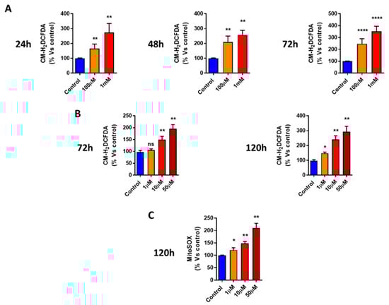 DFP induces total cellular reactive oxygen species (ROS) production in MCF7 cells. (A) Note that DFP increases the total cellular ROS production in a time-dependent and concentration-dependent manner (from 24 h to 72 h), with maximal effects observed at 1 mM. ** p < 0.001; **** p < 0.00001. (B) DFP treatments at 72 h and 120 h significantly elevate the total cellular ROS production after DFP treatment in the micro-molar range (1 to 50 μM). ns = not significant; * p < 0.01; ** p < 0.001. (C) DFP induces mitochondrial superoxide production in MCF7 cells and significantly elevates mitochondrial superoxide levels after DFP treatment in the micro-molar range (1 to 50 μM). ns = not significant; * p < 0.01; ** p < 0.001.