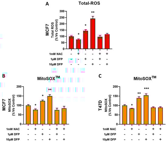 NAC reverted the DFP effect by restoring REDOX balance. (A) Note that DFP increases the total cellular ROS production in a concentration-dependent manner (from 1 μM to 10 μM). In the presence of 1 mM of NAC, the effect of DFP was reverted and the total cellular ROS content was similar to the control (vehicle alone). * p < 0.01; ** p < 0.001. (B,C) Similar trends were obtained by measuring the mitocondrial ROS content in MCF7 and T47D cells. Here, again the effect of DFP was reverted by NAC at concentrations of 1 mM and 10 mM. * p <0.01; ** p < 0.001; *** p < 0.0001.