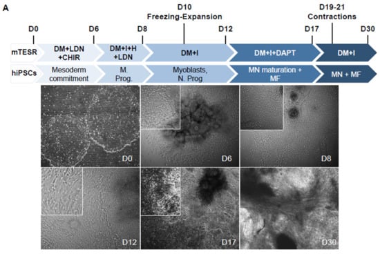 Different protocols exist for the differentiation of human pluripotent or embryonic stem cells for a large variety of terminally differentiated tissues. Nevertheless, differentiation of the skeletal muscle lineage remains challenging [5,26,27,28,29], with some methodologies relying on the ectopic expression of muscle-specific transcription factors by viral gene delivery [12,28,29,30,31] and limited enrichment in mature skeletal muscle fibers [2,12,13,14].