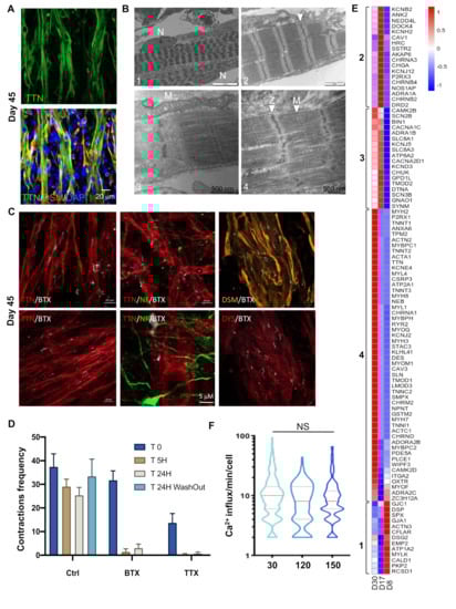 Ultrastructural and functional validation of hiPSC-derived myofibers. (A) Representative Z stacks of muscle fibers at Day 30, stained for Titin (TTN, green, upper panel) and merged between Desmin (DES, orange) and Titin filament (green, lower panel) at Day 30 postdifferentiation. Nuclei were counterstained with DAPI. (B) Ultrastructural features of differentiation. Control cells showed complete sarcomeric organization with highly organized myofibrillar patterns and fully mature sarcomeric banding pattern with clearly visible Z-lines (arrows, panels 2; 4), nuclei localized at the periphery of the fibers (panel 1, N) and large mitochondria (panel 3, M). Thick filaments were assembled with the formation of Z and M lines across the Myosin filaments (Panel 4). Z-lines were aligned, forming a clearly visible structural pattern (panels 1;2;4). We also observed I-bands of Actin filaments and A-bands (panels 2; 4). (C) Representative Z stacks of cultures stained for acetylcholine receptors (AChR) using Alpha Bungarotoxin coupled with Alexa 555 (White), and immunostaining of muscle fibers using anti-Titin (TTN, red), anti-Dystrophin (DYS, red), anti-Desmin (orange) and anti-NeuroFilament (NF, green) antibodies. We observed several undifferentiated acetylcholine receptors clusters at the surface of the myofibers (white). (D) Contractions of muscle fibers were recorded in real time by video microscopy in control cells (Supplementary Movie 1) prior to or after the addition of Alpha Bungarotoxin (α BTX) or Tetrodotoxin (TTX), to the cell medium, or after medium replacement and drug removal. Histogram displays the mean number of contractions ± S.D. shown by error bars, prior to drug addition (T0), 5 h (T 5H) or 24 h after (T 24 H), or 24 h after drug removal and medium replacement (T 24H washout). The addition of both drugs irreversibly inhibited cell contraction. (E) Heatmap of DEGs corresponding to the “contraction” GO terms in D8 vs. D17 and D17 vs. D30. Brackets identify genes differentially expressed for the different time points. Group 1, genes activated at D17; group 2, genes activated at D17 and D30; and group 3, genes upregulated at D8. (F) Intracellular calcium signaling in hiPSC-derived myofibers was measured using an Axio Observed microscope at day 30, day 120 (4 months) and day 150 (5 months) postdifferentiation. For each time point, >215 muscle fibers were analyzed separately. The number of contractions per minute and per fiber is reported as violin plots. No difference was observed in the calcium influx at day 120 and 150 compared to day 30 (ANOVA multiple comparison test followed by Brown-Forsythe and Welch correction p = 0.264 and p = 0.299; respectively). hiPSC-derived myofibers by transmission electron microscopy (TEM) at Day 45 post.