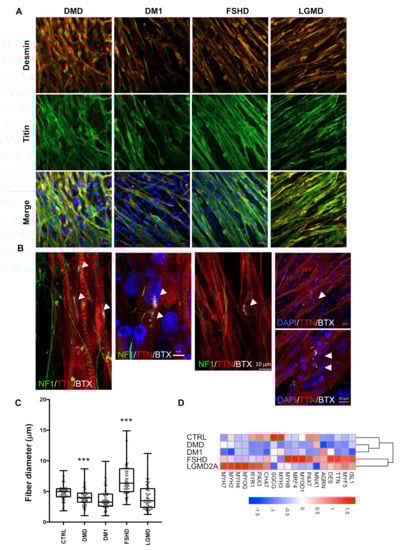 To evaluate the reproducibility and robustness of our protocol, we applied it to the four most frequent muscular dystrophies, i.e., Duchenne Muscular Dystrophy (DMD, OMIM 310200), Myotonic Dystrophy (DM1, OMIM 160900), Facio Scapulo Humeral Dystrophy (FSHD2, OMIM 158901) and Limb Girdle Muscular Dystrophy 2A (LGMD2A, or LGMDR1, OMIM 253600). Using antibodies against Desmin and Titin, we observed the formation of multinucleated, millimeter-long, aligned myofibers and a mature fiber striated pattern at D30 postdifferentiation (Figure 5A). We also observed immature AChR clusters at the surface of the fibers after α BTX staining (Figure 5B). Compared to our two control cells and the two clones analyzed for DM1 and LGMD2A, we observed that the fiber section size was significantly reduced in DMD cells, and wasvariable as well as slightly increased in FSHD2 cells (Figure 5C).