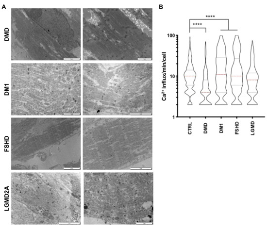 Functional and ultrastructural characterization of diseased hiPSC-derived muscle fibers. (A) Ultrastructural features of hiPSC-derived muscle fibers for different neuromuscular disorders. Electron microscopy was performed 60 days postdifferentiation. Representative images for DMD, DM1, FSHD and LGMD2A are presented. (B) Intracellular calcium signaling in hiPSC-derived myofibers was measured using an Axio Observed microscope at day 45 postdifferentiation. For each time point, >180 muscle fibers were analyzed. We report the number of influxes recorded per minute and per fiber as violin plots. Data were compared using an ANOVA multiple comparison test followed by Brown-Forsythe and Welch correction. DM1 myofibers presented lower calcium influx compared to the control (****; p < 0.0001), whereas calcium influx increased in FSHD and DMD myofibers (****; p < 0.0001). No difference was observed between the control and LGMD2A myofibers (p = 0.89).