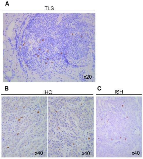 Detection of γδ T-cells using the H-41 antibody. (A) Detection of γδ T-cells by immunohistochemistry in a tertiary lymphoid structure (TLS) located close to a breast tumor. Detection of γδ T-cells in colon cancer sections by (B) immunohistochemistry (IHC) and (C) in situ hybridization (ISH).