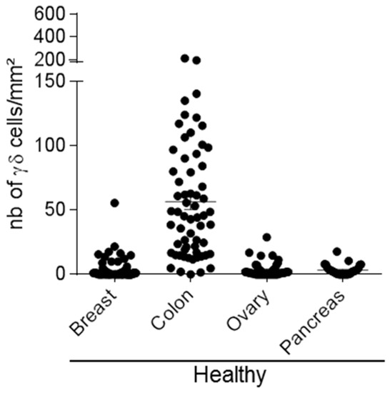 We first investigated the presence of γδ T-cells in sections from healthy colon (n = 62), ovary (n = 49), breast (n = 141), and pancreas (n = 31) samples. We observed a great heterogeneity. Indeed, γδ T-cells were abundant in normal colon (1 to 213 cells/mm2) and in some breast tissue samples (0 to 55 cells/mm2). Conversely, we detected only few γδ T-cells in normal pancreatic (0 to 17 cells/mm2) and ovarian (0 to 29 cells/mm2) tissue samples (Figure 2). This suggests that the presence of γδ T-cell infiltrates in normal tissues is variable among organs, ranging from medium to high in colon, medium to low in breast tissues, and very low or absent in ovarian and pancreatic tissue sections. We then investigated γδ T-cell infiltration in the corresponding tumor tissues.
