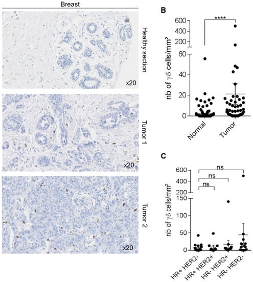 Detection of γδ T-cells in human breast samples. Immunohistochemical detection of γδ T-cells in 50 human breast cancer specimens. (A) One representative healthy breast area and two representative breast tumor sections with medium and high γδ T-cell density. (B) Scatter plot comparing γδ T-cell density in 141 normal breast samples and 50 breast tumors. (C) Scatter plot showing γδ T-cell density in 50 breast cancer samples, according to their hormone receptor (HR) and epidermal growth factor receptor 2 (HER2) status. Data are the mean ± SEM. **** p < 0.0001 (Mann–Whitney test for panel B); ns: non-significant (Kruskal–Wallis with Dunn’s multiple comparison test for panel C).