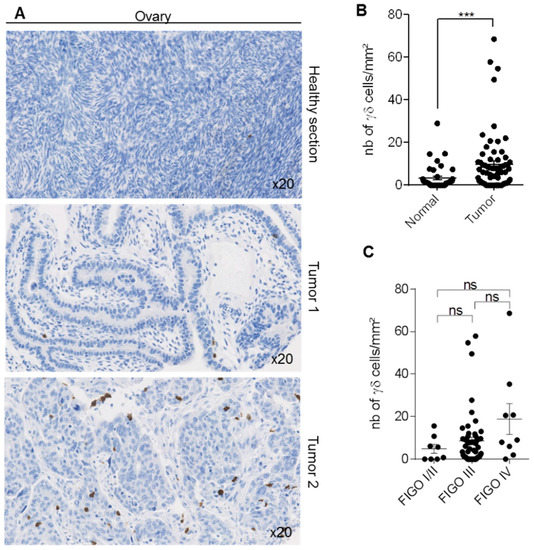 Detection of γδ T-cells in human ovarian samples. Immunohistochemical detection of γδ T-cells in 72 ovarian tumors and 49 paired normal ovarian samples. (A) The figure shows one representative normal ovarian tissue and two representative tumors with low and high γδ T-cell density. (B) Scatter plot comparing γδ T-cell density in normal and cancer tissue samples. (C) Scatter plot showing γδ T-cell expression in the 71 ovarian cancer samples, classified according to the FIGO stage. Data are the mean ± SEM. Ns: non-significant; *** p < 0.001 (Mann–Whitney test for panel B, Kruskal–Wallis with Dunn’s multiple comparison test for panel C).