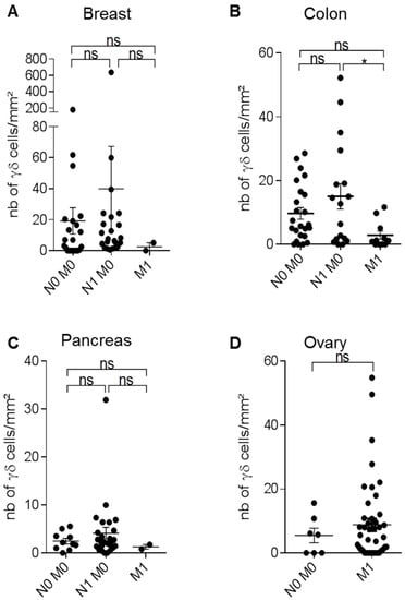 Analysis of γδ T-cell density in function of the tumor, node, and metastasis (TNM) classification. Immunohistochemical detection of γδ T-cells in breast, colon, pancreatic, and ovarian tumors in chemotherapy-naïve patients. Scatter plots comparing γδ T-cell density in N0 M0, N1 M0, and M1 breast (A), colon (B), pancreatic (C), and ovarian (D) tumors. Data are the mean ± SEM. Ns: non-significant; * p < 0.05 (Kruskal–Wallis with Dunn’s multiple comparison test).