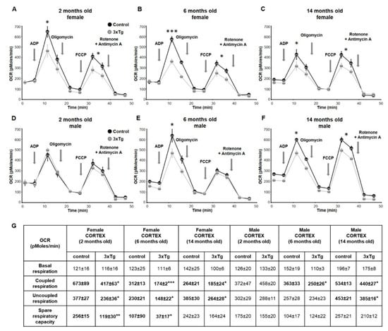 Representative measurements of oxygen consumption rates in mitochondria isolated from the cortex of 3xTg and age-matched control females at 2 months (A), 6 months (B) and 14 months of age (C), and males (D–F). Basal level of OCR was measured in the presence of Complex I substrates pyruvate and malate. Coupled respiration was measured after the addition of ADP (2 mM). Oligomycin (1 μM) was then added to terminate coupled respiration through inhibition of ATP synthase. The uncoupled respiration rate was determined by adding the uncoupling agent FCCP (4 μM) to remove the pH gradient and enable maximal rates of electron transport. The injection of rotenone (1 μM) and antimycin A (1 μM) blocked respiratory electron flux at complexes I and III (non-mitochondrial respiration rates). Calculated coupled respiration at state 3 and uncoupled respiration were significantly decreased (* p < 0.05) in cortical mitochondria of 3xTg female mice at 2, 6 and 14 months, and SRC was significantly reduced at 2 and 6 months (Table G, in bold). In 3xTg males, coupled respiration was significantly decreased at 6 and 14 months, and uncoupled respiration was down at 14 months (* p < 0.05). Data are expressed as OCR in pmoles/min, and values are expressed as mean ± SEM of n = 4–6 replicates.