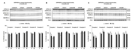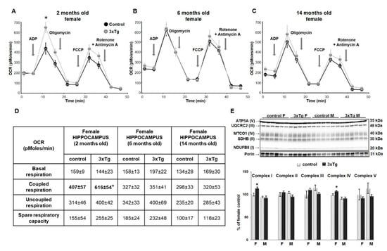 Relative levels of OXPHOS proteins in cortical mitochondria of 3xTg mice and their respective controls. Representative WBs (upper panels) for Complex I (NADH dehydrogenase beta subcomplex subunit 8, NDUFB8), Complex II (succinate dehydrogenase subunit B, SDHB), Complex III (cytochrome b-c1 complex subunit 2, UQCRC2), Complex IV (Cytochrome c oxidase subunit 1, MTCO1), and Complex V (ATP synthase subunit alpha, ATP5A) and relative quantification (lower panels) for protein levels of OXPHOS subunits normalized to porin, in 3xTg female and male mice and their respective controls at 2 months (A), 6 months (B) and 14 months of age (C). Results are expressed as percent change from the control mean of 100% ± SEM of n = 4–6 animals per group (* p < 0.05). Contrary to our findings in the cortex, hippocampal mitochondria showed increased coupled respiration in female 3xTg mice at 2 months of age (Figure 3A,D; * p < 0.05), followed by the increase in protein level of Complex I and IV subunits (Figure 3E, * p < 0.05). This increase was not sustained at later stages, as we found no changes in OCR or protein level of Complex I–V subunits in older 3xTg female mice (Figure 3B–D). Neither mitochondrial bioenergetics’ parameters nor protein levels of analyzed subunits of Complex I–V in the hippocampus of 3xTg males were altered in any of the studied age groups.