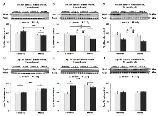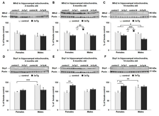 As suggested earlier, mitochondrial size and shape as regulated by mitochondrial dynamics are very important for their proper function. In cortical mitochondria, two-way ANOVA indicated that Mfn2 protein levels were significantly different as a function of sex (Mfn2 protein levels were higher in females, *** p < 0.001) in 2- and 6-month-old mice (Figure 4A,B) and as a function of genotype (Mfn2 protein levels were lower in 3xTg animals, *** p < 0.001) in 6- and 14-month-old mice (Figure 4B,C), with a significant interaction effect between sex and genotype only at 2 months old (** p < 0.01). Analysis of simple main effects in this group indicated a sex effect in 3xTg mice only, with significantly lower levels of Mfn2 in males versus females (p < 0.001). The effect of genotype was significant in male mice only, with a downregulation in the 3xTg model (p = 0.03). Drp1 protein levels were significantly different in cortical mitochondria as a function of sex in 2- and 6-month-old mice (Drp1 protein levels were higher in males, *** p < 0.001 and ** p < 0.01 respectively, Figure 4D,F), with a significant interaction effect between sex and genotype only in 6-month-old mice (*** p < 0.001). Here, levels of Drp1 were significantly higher in males than females in C57BL/6 mice (*** p < 0.001), with no such effect of sex in 3xTg mice. Drp1 levels were significantly higher in the 3xTg female relative to control females (p = 0.013) but were reduced in 3xTg males relative to male control mice (p = 0.014).