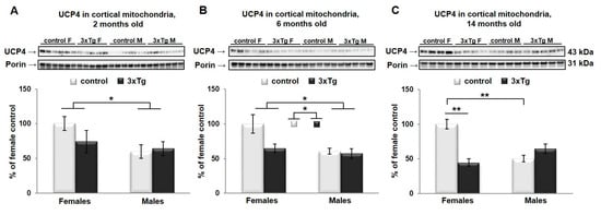 Levels of UCP4 protein were also analyzed by two-way ANOVA. There was a significant main effect of sex in UCP4 protein levels in cortical mitochondria (UCP4 protein levels were higher in females, * p < 0.05, Figure 6A–C), regardless of age. UCP4 protein levels were significantly different as a function of genotype at 6 and 14 months (UCP4 protein levels were lower in 3xTg animals, * p < 0.05 and ** p < 0.01 respectively, Figure 6B,C), with a significant interaction effect between sex and genotype at 14 months (* p < 0.05). Simple main effects in this age group revealed that in control mice, males had significantly less UCP4 than females (** p = 0.001), with no such sex effect in 3xTg mice. The effect of genotype was significantly only in females, with a reduction in 3xTg mice relative to C57BL/6 control mice (** p = 0.001).