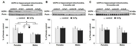 In hippocampal mitochondria, two-way ANOVA analysis revealed that UCP4 protein levels were significantly different as a function of sex (UCP4 protein levels were higher in females, * p < 0.05, Figure 7A) and as a function of genotype (UCP4 protein levels were lower in 3xTg animals, * p < 0.05, Figure 7A) only at 2 months, with a trend towards a significant interaction effect between sex and genotype (p = 0.067).