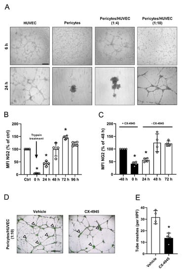 3.4. Effect of CK2 Inhibition in Pericytes on Endothelial Tube Stabilization