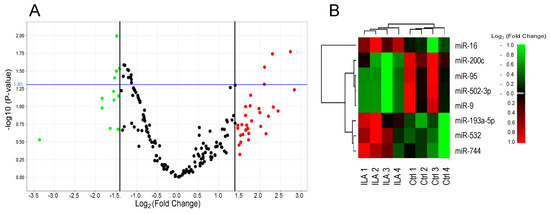 The miRNA expression profiling of ILA and Ctrl from the screening cohort allowed the identification of four upregulated miRNAs (miR-532-5p, miR-193a-5p, miR-16-5p and miR-744-5p) and four downregulated miRNAs (miR-9-5p, miR-502-3p, miR-200c-3p and miR-95-3p) in ILA compared to Ctrl (p < 0.05; log2 Fold Change > 1.4) (Figure 1 and Supplementary Table S2).