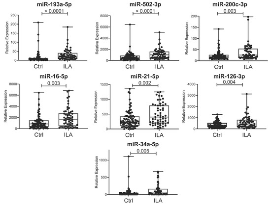 Results obtained in this validation cohort showed that relative expression levels of seven miR-(193a-5p, miR-502-3p, miR-200c-3p, miR-16-5p, miR-21-5p, miR-126-3p and miR-34a-5p) were significantly higher (p < 0.05) in ILA compared to Ctrl (Figure 2). Among them, four miRNAs were candidates discovered in the screening phase (miR-193a-5p, miR-502-3p, miR-200c-3p, miR-16-5p), and three miRNAs were the additional candidates selected from literature as associated to IPF (miR-21-5p, miR-126-3p and miR-34a-5p). Meanwhile, relative expression levels of miR-9-5p, miR-95 and miR-532 (from the screening cohort), and miR-30b-5p and miR-106b-5p (additional miRNAs from literature) were not statistically different among study groups (data not shown). Correlation analysis indicated that gender, age, smoking history, BMI or lung functional parameters did not correlate with levels of any candidate miRNA (Supplementary Table S4). We found that some miRNAs correlated with some respiratory functional parameters related to gas exchange such as DLCO and oxygen saturation, but their correlation values were too weak (r < 0.2) (Table S4).