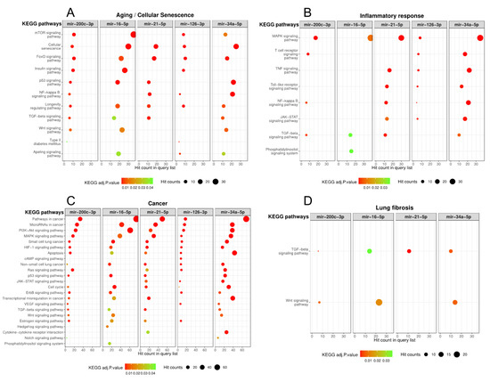 Significantly enriched pathways of ILA-associated miRNAs involved in (A) aging/cellular senescence, (B) inflammatory response, (C) cancer and (D) lung fibrosis. Figure shows the KEGG enriched pathways (adjusted p < 0.05) using the experimentally validated targets of ILA-associated miRNAs. Colors indicate p-values and circle sizes indicate number of target genes in each pathway. KEGG: Kyoto Encyclopedia of Genes and Genomes database.