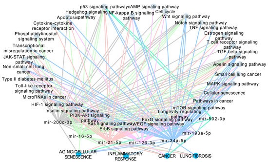 Network of the ILA-associated miRNAs and their enriched pathways involved in the biological processes (A) aging/cellular senescence, (B) inflammatory response, (C) cancer and (D) lung fibrosis. Nodes represent either pathways, miRNAs, or biological processes. Edge colors are specific for each miRNA.
