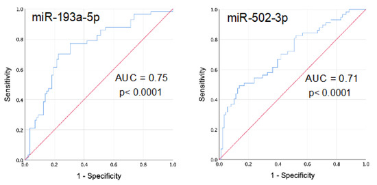 To investigate a potential diagnostic value of the differentially expressed miRNAs, we performed a receiver operator characteristic (ROC) curve analysis for the seven upregulated miRNAs in ILA. Results indicated that levels of miR-193a-5p and miR-502-3p discriminate ILA from Ctrl with an area under the curve (AUC) of 0.75 and 0.71, respectively (Figure 5). The rest of the miRNAs showed AUC values below 0.70 (from 0.65 to 0.66, data not shown). Data of the diagnostic accuracy of miR-193a-5p and miR-502-3p are shown in Table 2. We found that miR-193a-5p had the best sensitivity (61%) at a fixed specificity of 81% as a single biomarker compared to miR-502-3p (sensitivity 51%). Additionally, we performed logistic regression analysis to combine these two candidate miRNAs in order to improve the diagnostic utility. As it is shown in Table 2, sensitivity values did not improve by combining miR-193a-5p and miR-502-3p.