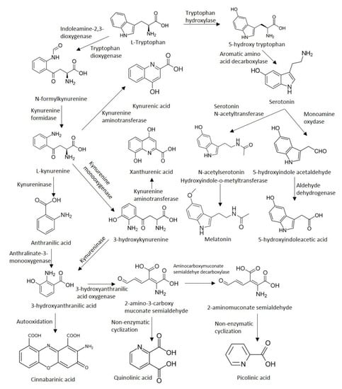 - Moroni, F. Tryptophan metabolism and brain function: Focus on kynurenine and other indole metabolites. Eur. J. Pharmacol. 1999, 375, 87–100. [Google Scholar] [CrossRef]