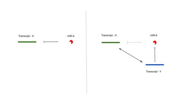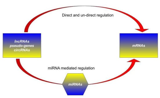 Since miRNAs can recognize their target sites on different RNA molecules, it was suggested that miRNAs could be capable of mediating a regulatory crosstalk between the various components of the transcriptome. This miRNA regulation should be modulated by other RNA molecules, as both mRNAs and non-coding RNAs are known to be bound by miRNA and to be significantly expressed in many different biological conditions. This mechanism offers an additional post-transcriptional gene regulation mechanism and a complementary point of view for the role of the large number of transcribed, but not translated, RNAs (see Figure 1) [].