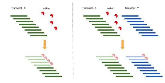 When two or more RNAs share common miRNA response elements (MREs) (mostly on their 3’ untranslated region (3’UTR), in the case of mRNAs) they can be targeted by the same microRNA(s), implying that they can cross-regulate each other indirectly because they compete to bind the same pool of sequences (see Figure 2) [,].