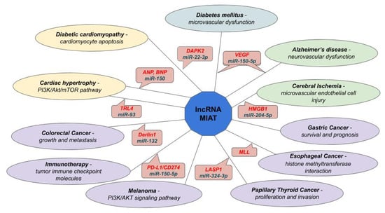 As a small and non-exhaustive example, lncRNA-myocardial infarction and associated transcript (MIAT) was characterized in a large variety of conditions [] (see Figure 4). As already mentioned when discussing cardiac hypertrophy, MIAT has been found acting on at least two distinct miRNAs in this abnormal enlargement and thickening of the heart muscle. miR-150, an important miRNA involved in cardiac and cardiomyocyte hypertrophy, affects the development of cardiac hypertrophy as a downstream effector of MIAT []. miR-93 differential abundance, mediated by lncRNA-MIAT, influences the expression of target genes, as the highly conserved Toll-like receptor 4 (TLR4). In particular, MIAT knockdown can enhance miR-93 and inactivate the PI3K/Akt/mTOR pathway via regulating the TLR4 in angiotensin II-induced cardiac hypertrophy []. MIAT works as a ceRNA in pathological angiogenesis related to diabetes mellitus microvascular dysfunction, by competing with vascular endothelial growth factor (VEGF) for miR-150-5p [] and, following the same pathway, in neurovascular dysfunction by inducing progressive neuronal loss and Alzheimer’s disease []. After cerebral ischemia, lncRNA-MIAT has proved to regulate the expression of HMGB1 (high-mobility group box 1) in cerebral microvascular endothelial cell (CMEC) injury by competing for miR-204-5p []. The same lncRNA has been associated with diabetic cardiomyopathy (DCM) for it affects the expression of death-associated protein kinase 2 (DAPK2) by sponging miR-22-3p: the resulting up-regulation of DAPK2 itself leads to cardiomyocyte apoptosis in DCM []. Its involvements in cancer are emerging too: in melanoma by acting on key master regulators of the signaling pathway []; in papillary thyroid cancer by sponging hsa-miR-324-3p and up-regulating LIM and SH3 domain protein 1 (LASP1) []; in colorectal cancer by regulating the miR-132/Derlin-1 pathway []. New observations have emerged in the control of immune checkpoint molecules: through hsa-miR-150-5p sponge interaction, lncRNA-MIAT, together with HLA complex P5 (HCP5), has been associated with the up-regulated expression of PD-L1/CD274, suggesting new involvements in the field of tumor immunity and immunotherapy []. Independently from the ceRNA mechanism, the same lnc-RNA MIAT molecules were characterized as oncogenic in esophageal cancer, as they promote cell invasion and migration by interacting with histone methyltransferase mixed-lineage leukemia (MLL) proteins [] and, moreover, in gastric cancer, they have been linked to the prognosis and survival predictions: for instance, high MIAT level in serum exosomal characterizes patients as more prone to develop gastric cancer and its up-regulation is associated with shorter survival periods and represents an independent prognostic factor for gastric cancer [].