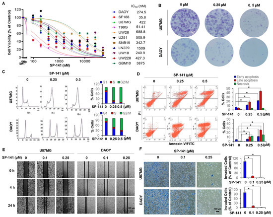 SP-141 shows therapeutic potential in p53 wt and p53 mutant brain tumor cell lines. (A) Cytotoxicity of SP-141 against brain tumor cell lines. Cell growth inhibition was analyzed by the resazurin reduction assay (data represent the results of three independent experiments performed in triplicate). Cells were treated with different dilutions of the compound (0–25 µM) for 72 h. Cytotoxicity (IC50) values in nM are stated for each cell line. (B) Colony formation of two representative cell lines. Cultured DAOY and U87MG cells were treated with SP-141 at different concentrations for 24 h. Twenty-one days after drug removal, cells were fixed and stained with crystal violet and images were prepared. (C) Analysis of cell cycle progression after treatment with different concentrations of SP-141 for 24 h. (D) Apoptosis analysis by flow cytometry using the Annexin V-FITC/PI stain assay. U87MG and DAOY cells were incubated with various concentrations of SP-141 for 24 h then were stained with membrane phosphatidylserine-binding Annexin V-FITC and propidium iodide (PI) (panels Lower Left: FITC Annexin V- and PI- negative; Lower Right: Annexin V-FITC positive; Upper Right: FITC Annexin V- and PI-positive; Upper Left: PI-positive) (* p < 0.01). (E) Cell migration. U87MG and DAOY cells were grown to confluence in six-well plates and a scratch was made at the start of the experiment. The cells were then exposed to SP-141 at the concentrations shown. The wells were imaged at different time points. Scale bars: 100 µm. (F) U87MG and DAOY cells were subjected to a Transwell invasion assay 12 h after treatment with SP-141 (0, 0.1, and 0.25 µM) as specified. The crystal violet dye staining images of lower chambers with migrated cells are shown (* p < 0.01). Scale bars: 100 µm.